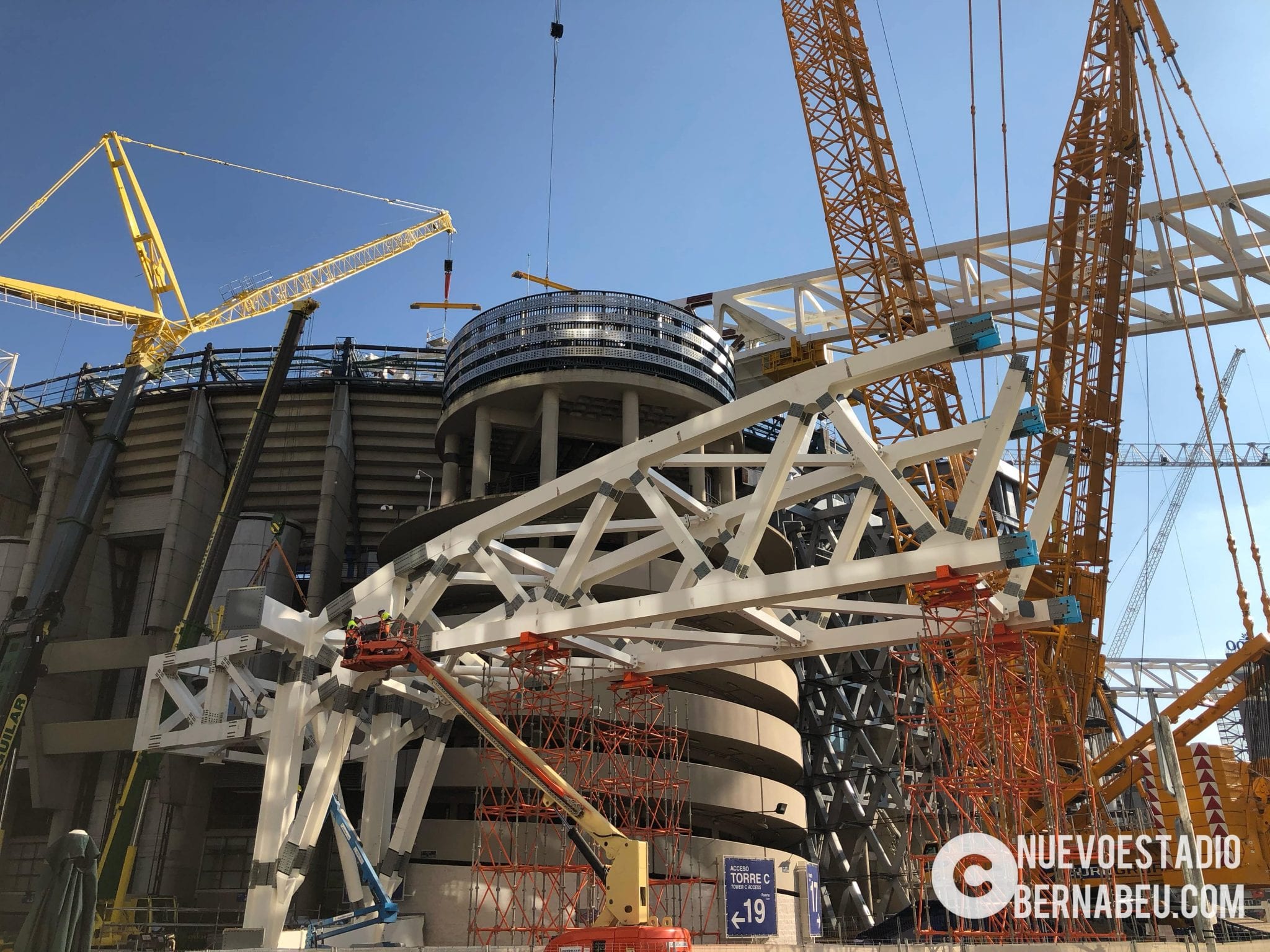 Semana muy lluviosa y ventosa en Madrid que no ha sido óbice para que la continuidad de las obras del nuevo Bernabéu continúe con paso firme y sin mayores contratiempos. Las actuaciones en las cerchas principales de cubierta han continuado durante toda la semana. En la cercha norte se han izado los tirantes inclinados de […]