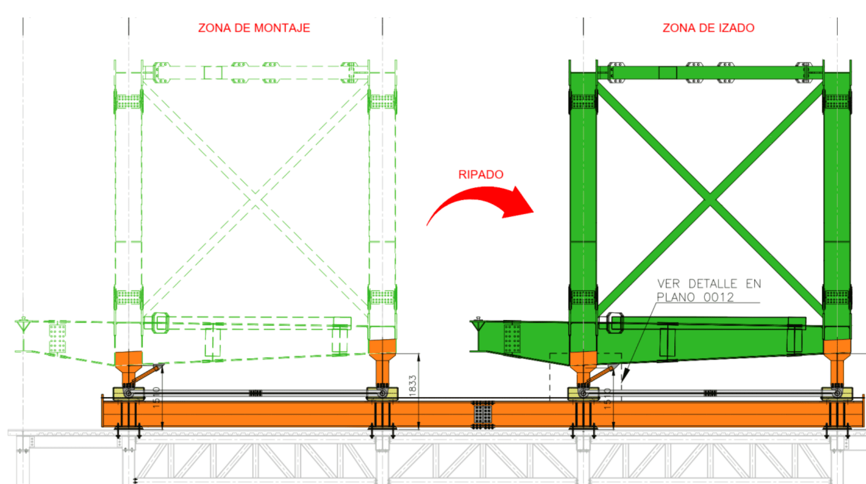 Una vez ejecutado con éxito el izado de la cercha lateral este y la posterior transferencia de las cargas a los carretones de las cerchas principales, se prepara la próxima maniobra de ripado (movimiento de traslado) de la cercha de rodadura a la posición de izado que ha dejado su hermana pequeña que comenzará este […]