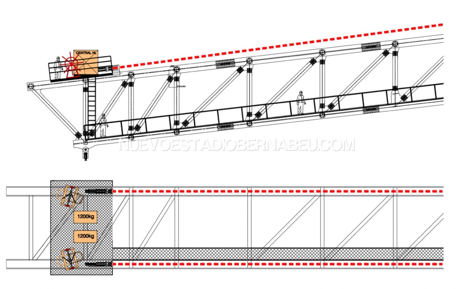 En cada una de las 2 cerchas principales, en el lado de la avenida de la Castellana (lado Oeste), se situaron 2 cilindros hidráulicos de heavy lifting (total 4 unidades).