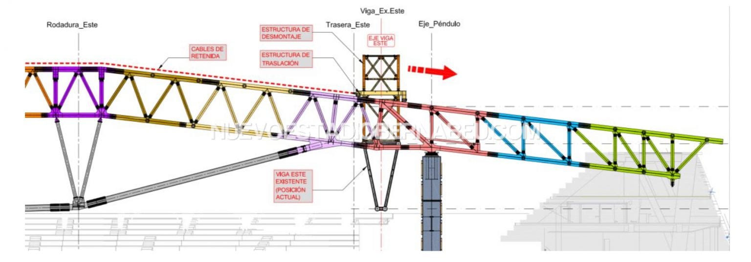 Una vez realizado el desplazamiento de la cubierta nueva y situada en su posición definitiva, se procederá́ al desplazamiento de la viga del Este hasta su posición final para su descenso a tierra mediante grúas. En esta etapa se dispondrán los cilindros de heavy lifting en el lado Este, en las cercanías de los péndulos.