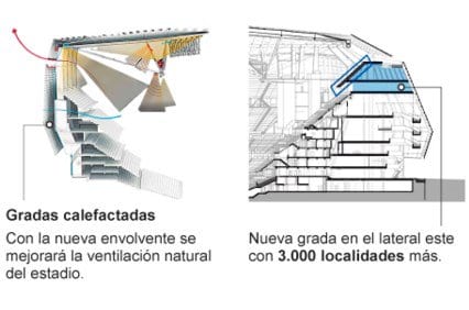 - Nueva terraza perimetral con vistas al interior y al exterior del estadio que irá sobre un voladizo de nueva construcción.